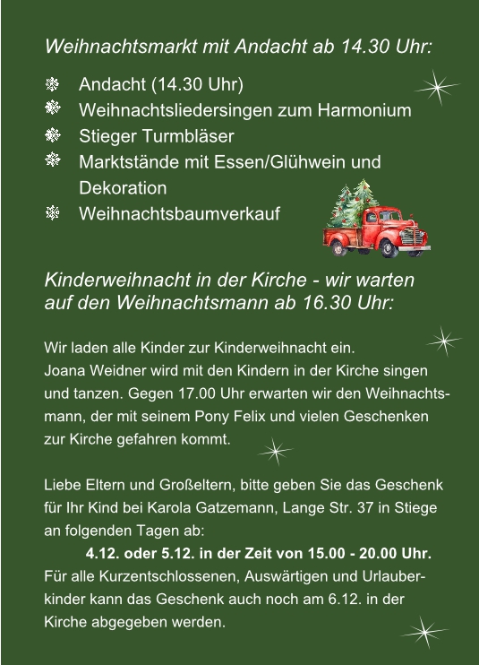 Sind die Lichter angezündet - heißt es wieder am 6. Dezember 2025. Das Außengelände verwandelt sich in einen kleinen aber feinen Weihnachtsmarkt mit liebevoll dekorierten Marktständen, die zum Schlemmen einladen. Stimmungsvolle Beleuchtung rundet die gemütliche Atmosphäre ab und den Weihnachtsbaum für zuhause kann man auch gleich kaufen. Eine Andacht 14.30 Uhr läutet den Tag ein, mit dem beliebten Weihnachtsliedersingen zum Harmonium geht es weiter. Eine Zusage haben wir bereits: Der Weihnachtsmann hat sich diesen Termin extra für uns freigehalten und kommt persönlich mit Wagen oder Schlitten - je nach Wetterlage - vorbei, um die Kinder zu beschenken. Zuvor feiern wir die Kinderweihnacht in der Kirche. Was sich im vergangenen Jahr aufgrund des schlechten Wetters spontan entwickelt hat, möchten wir gern zu einer Tradition machen. Ab 16.30 Uhr gehört die Kirche den Kindern. Unter Anleitung von Joana Weidner darf wieder getanzt und gesungen werden, bis der Weihnachtsmann gegen 17.00 Uhr erwartet wird. Die Geschenke, die der Weihnachtsmann bringt, geben die Eltern/Großeltern bitte wieder vorher bei Karola Gatzemann, Lange Str. 37 in Stiege ab. Bitte den vollständigen Namen des Kindes nicht vergessen. Wir bitten um Abgabe der Geschenke am 4. oder 5. 12., zwischen 15.00 und 20.00 Uhr. Für alle Kurzentschlossenen, Auswärtigen und Urlauberkinder ist die Abgabe des Geschenkes auch noch am 6.12. in der Kirche möglich.